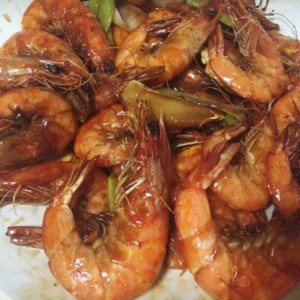锅里再放少许油把姜片、葱段爆炒香后放之前煎好的大虾,炒一下倒入调好的汁!翻炒收汁即可!