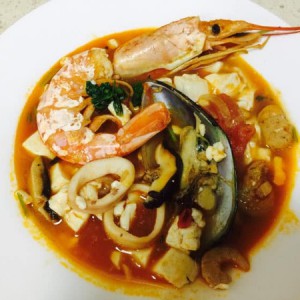 煮汤的同时,使用另外一支平底锅,放入适量橄榄油,倒入海鲜,炒熟,可根据人格口味加少量黑胡椒碎。