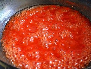 将糖腌渍过的番茄汁水倒入锅中,煮开后转小火熬。如果感觉糖少了,可以再加一些