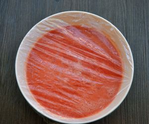 绞碎的番茄汁倒入碗内,加入适合自己口味甜度的绵白糖,本配方中120克只是个参考数。怕胖想减肥的可以把绵白糖换成等量的木糖醇,用保鲜膜封上放进冰箱冷藏半天,腌渍出番茄的果糖