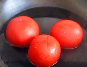 把洗干净的番茄用刀划出十字,放在开水锅煮三四分钟左右,十字开花即可,取出放凉