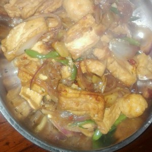 豆腐成金黄色,放少水慢火,倒入洋葱,青椒,姜丝,蒜蓉,翻炒,盖上锅盖1~2分钟。