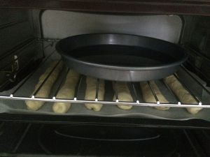 放入烤箱第二次发酵40分钟,同时用另外一个盘子装点温水放烤箱里(这样发酵后的面团才不会干,烤熟后就不会太硬了)