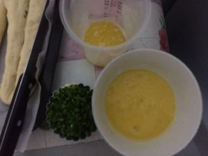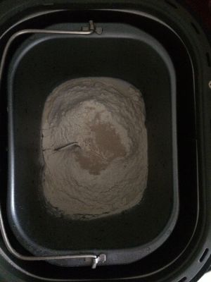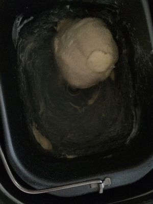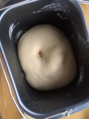 除葱油用料及黄油外,所有材料放进面包机(注意:需先放牛奶,用面粉将酵母与牛奶隔开,即酵母最后放,如图。其他材料随意)选择和面程序,开始和面,约30分钟