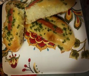 火腿两根,长切成6条(喜欢火腿多点的可以用三根切半成六份)将火腿塞入刀口后淋刷上葱油