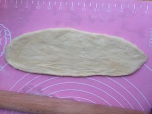 从长的那边开始卷,卷好后将开口朝下放入铺好油纸的烤盘