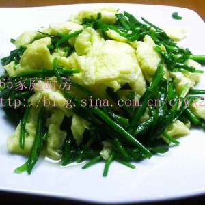 锅中再入少许油,入韭菜煸炒,倒入炒好的鸡蛋,加盐、味精炒匀,即可盛出。