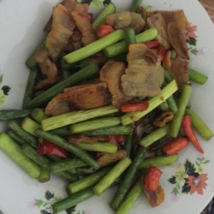 加入蒜苔小米辣入锅,中火即可,翻炒到蒜苔断生。就可以准备出锅了。