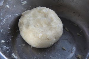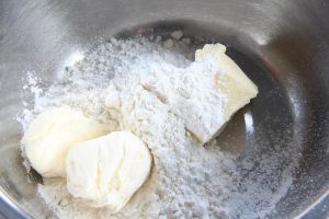 先制作面团部分的:黄油室温软化后加入黄油跟奶酪,用手抓均匀