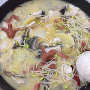 3,香菇,豆芽,土豆,均洗干净,按喜好切好然后下开水煮熟备用(因为家里人喜欢➕肠仔,所以家里适量的美国厨师肠)