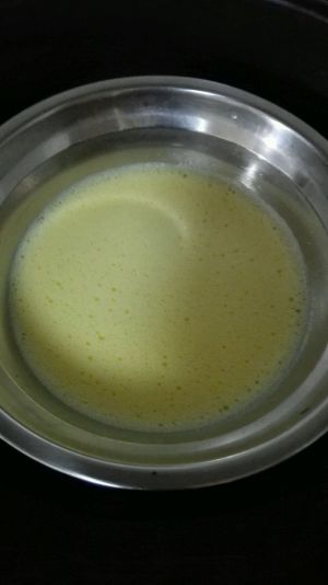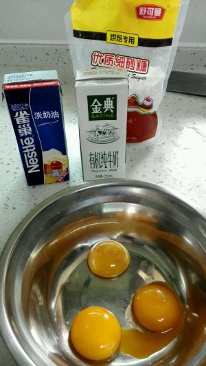 蛋黄中放入40克糖,加牛奶搅拌均匀,隔水在锅中小火加热,不断搅拌,直至冷却粘稠