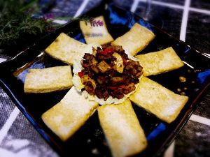 牛肉剁末用油和酱油,鱼露抓均热锅凉油炒加藕块(切小点),加人切碎的盐蛋,少许酱油,鸡精炒匀,放入红椒段调色