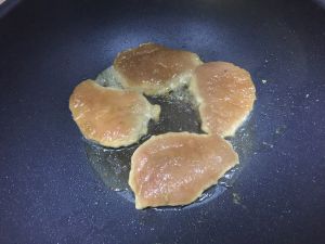 然后将腌制好的猪扒去掉渣汁,放入锅中煎至两面金黄即可装入盘中
