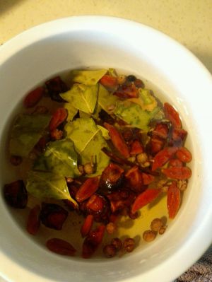 花椒 香叶 大料 枸杞 开水泣上 放一边晾凉 水有用