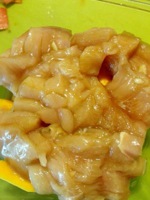 鸡肉切鱿鱼卷刀 或者切丁 切丝 切片都可以 入酱油 耗油 料酒 葱姜蒜 抓啊抓啊