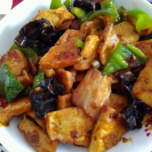 锅中加油!加入五花肉炒香,再加入葱跟蒜爆香后加入郫县红油豆瓣酱炒香,加入70-100毫升清水,调成汁,根据个人口味加入盐、白糖调味,加入青椒,木耳,加入水淀粉勾芡,再将煎好的豆腐倒入翻炒,加鸡精香菜出锅即可~
