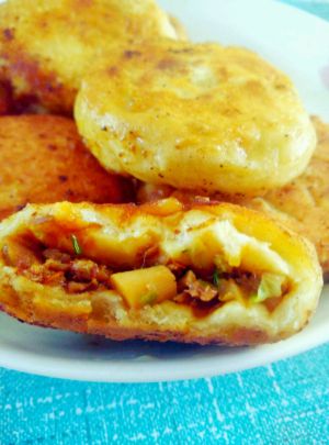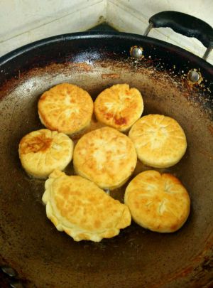 锅内少放油把饼放进锅内煎熟,一分钟左右不要胡了,两面都成金黄色,锅内放点水,盖上锅盖,放在小火上焖一会,