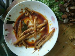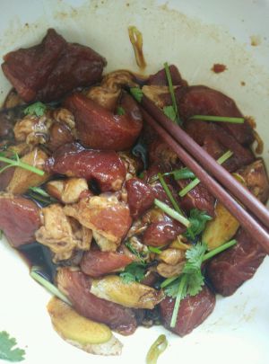 肉切成块,放入料酒,酱油,鸡精,盐,姜片,葱段,香菜搅拌腌40分钟左右