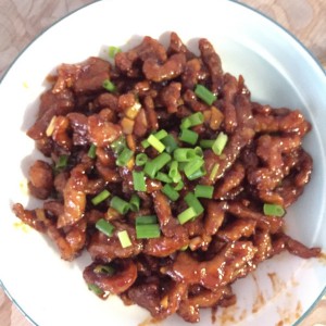 将腌好的里脊肉拌上适量面粉,放油里炸金黄,盛盘,沥干油。