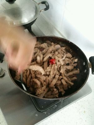 锅里放油,烧热后放花椒,大料,干辣椒,倒入牛肉翻炒,接着放入料酒,生抽,老抽,糖,翻炒均匀。