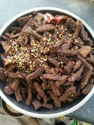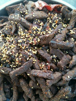 此时放入辣椒面和孜然粉或胡椒粉,盐适量,放入芝麻,接着翻炒,直到将肉条拷干,(依个人的口味,愿意吃硬的,就拷的时间长些;愿意吃软点的,就拷的时间短些)