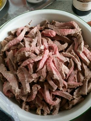 牛肉洗净,放锅里用热水汆一下去掉血水后,盛出晾凉后,切条。