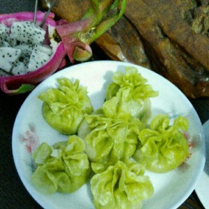 开水上锅,用黄瓜片垫底,放花饺,蒸7分钟