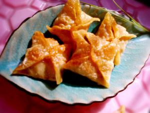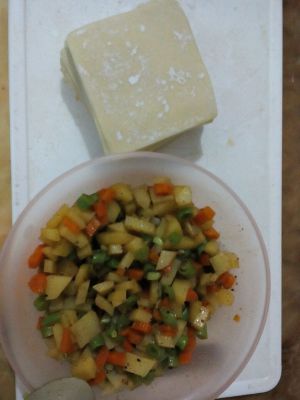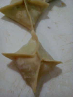 材料切成粒过水,加胡椒粉、咖哩粉、一点酱油还有盐调好,用的是四方饺子皮