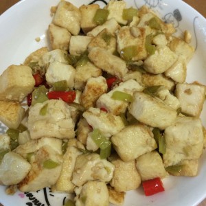 青椒下油锅炒至半熟,加豆腐翻炒(每次翻炒间隔长一点)。豆腐两面略微金黄时,加盐、生抽少许、朝天椒(视个人口味)下锅翻炒