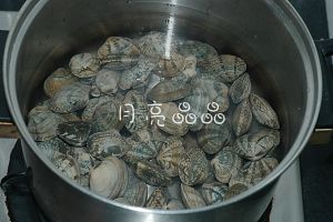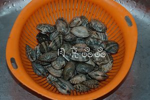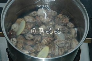 锅中放水放两片姜煮开后,倒入花蛤,煮一分钟左右,看到花蛤一张开口,立即用筷子一个个夹出沥水待用.
