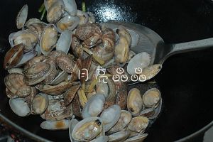 倒入焯好水的花蛤,快速翻炒至酱汁包裹住花蛤,起锅,撒葱花.