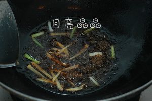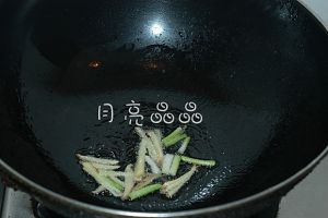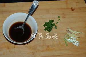 准备一个小碗,用两勺蚝油,一勺海鲜酱,一勺料酒,三勺清水的比例调制成酱汁.葱切段,葱白和葱青分开,姜切丝.