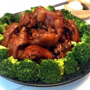 拣掉猪蹄里的香料,盛盘。在烧猪蹄时准备好西兰花用水加盐烫熟。摆在猪蹄周围装饰。