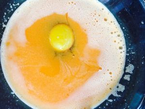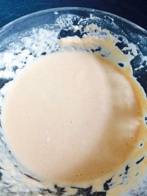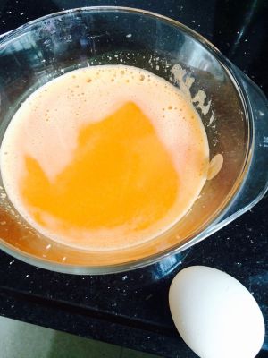 加入100克面粉搅成没有面糊,由于胡萝卜浆带颗粒需要把面糊弄粘稠,否则中间易裂。
