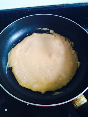 冷锅冷油,倒入三分一的面糊,稍微倾斜转动平底锅使面糊摊开