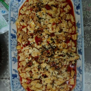 加入过滤过水的豆腐块,加入糖味精盐适量。加少量水盖上锅盖大火烧几分钟