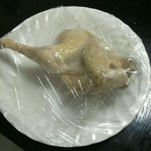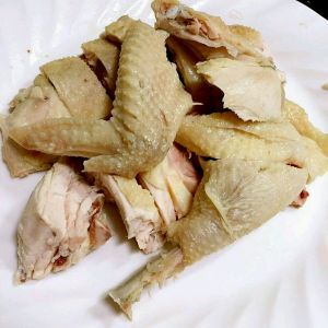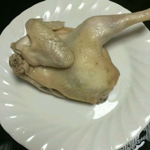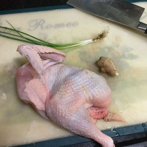 清远鸡半只,洗干净备用。小葱两三根,切段。姜切四片薄片。加入葱姜、半只清远鸡,水没过鸡,大火烧开后转中火煮20分钟。小贴士:姜葱少放,主要是用来提鲜去腥,但多了容易盖过鸡味。煮20分钟就可以,久了肉老,短了鸡肉带血。