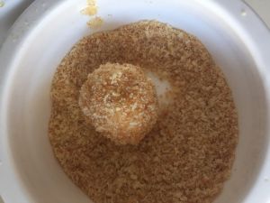 放入面包糠里滚几圈(面包糠是自己用吃不了的吐司做的,豆果搜索一下面包糠的做法有很多,很方便)