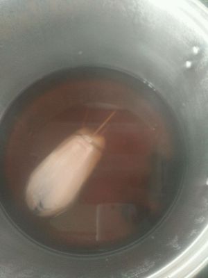 用牙签固定,锅里加水,放红糖,红枣,大火煮开,转小火,炖至汤汁浓稠,藕绵软,