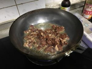 不放油 大火炒掉羊肉水分 继续撒盐 有焦感关火 洗锅