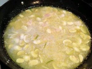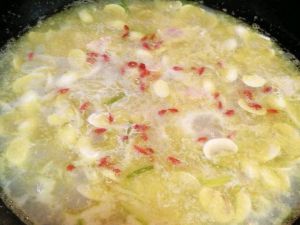 沿锅边加入适量的温水,放葱白段,胡椒粉煮开