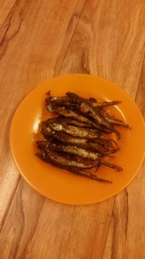 腌好的多春鱼漂洗下,放入黑胡椒,海盐,孜然,热油锅,油热后。在下锅前放入干淀粉,既把干又很生成一层保护膜,炸好后还是脆脆的外壳。