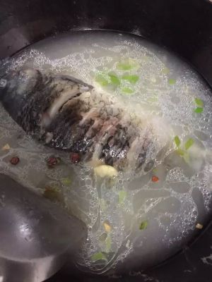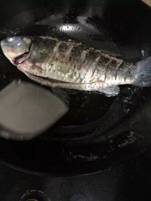 油热两面煎鲫鱼,微黄时放入葱姜蒜爆香(油锅一定要热,否则会使鱼皮黏在锅上,或者开火前用生姜擦拭锅面)
