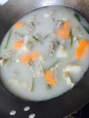 本来没准备上菜谱的前面都没拍照,试了下味道太棒了还是分享下吧,羊肉冷水下锅同姜片,蒜叶,八角,一点点十三香,焯烫一会去膻味。另起一锅开水、将焯过的羊肉洗净同花椒,蒜叶段,姜片,料酒一起放入开水锅里,大火煮沸后转小火煮一小时,汤成奶白色放入胡萝卜再煮半小时,加入适量的盐和鸡精就可以出锅了。