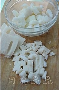 梨去皮去核,切小块。藕去皮切小块(处理藕的时候动作要快,否则藕会发黑,或者切好泡在滴了白醋的水里,可以有效避免藕发黑)。