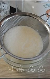 搅打好梨藕汁用纱布或者筛网过滤(用纱布效果会比较好,可以包起来挤出汁,我手边没纱布,所以用了筛网)。