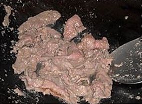 锅里放油,烧热,倒进牛肉,尽量把牛肉铺开,煎至变色;
