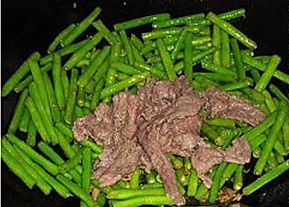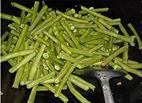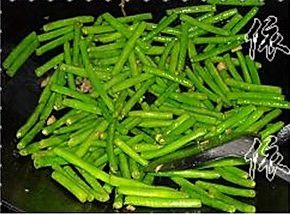 边炒边洒水,把豆角煸炒至全部转青绿色,加入3汤匙水,盖上锅盖大火煮3分钟;