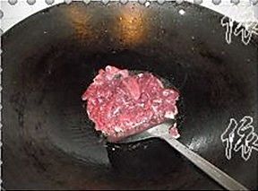 加入牛肉,翻炒均匀,放适量盐(牛肉腌过的,盐要适量),放一点点白糖提鲜,翻炒至盐、糖融化;