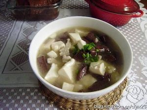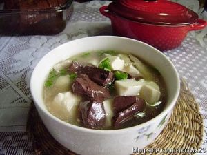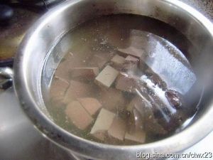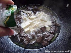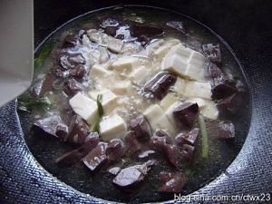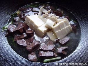 倒入猪血块、豆腐块、肉丝烧开,加盖中小火煮十分钟